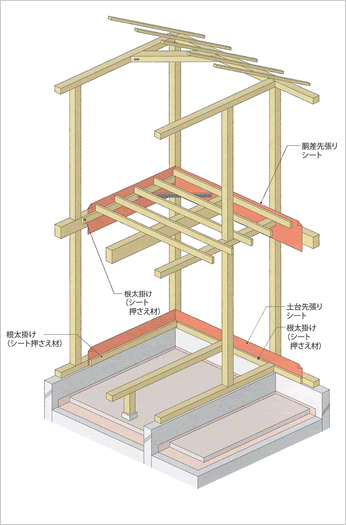 この項では、胴差部分と土台部分の先張りシートの施工を省略できる工法の例を示します。根太工法では、床根太と外壁との取り合