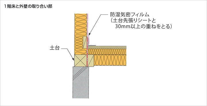 ●外壁の防湿気密フィルムの下端は床合板との取り合い部分で折り曲げ、床合板に30mm以上重ねるように施工します。