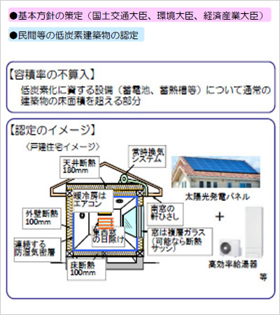 この法律では、市街化区域等内において、低炭素化のための措置が講じられた建築物の新築等をしようとする者は、低炭素建築物新築等計画を作成し、所管行政庁の認定を申請することができます。申請を受けた所管行政庁は、低炭素建築物新築等計画が建築物の低炭素化を促進するための基準に適合するときは、計画を認定することとしております。