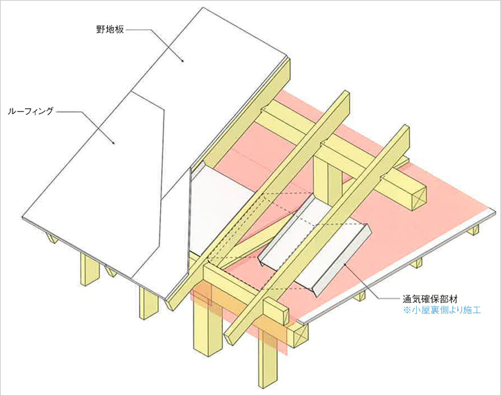 ・たるきの施工後に、野地板、ルーフィングおよび屋根葺き材の施工をします。雨押え部分で通気できるように、野地板にはあきを設けておきます。