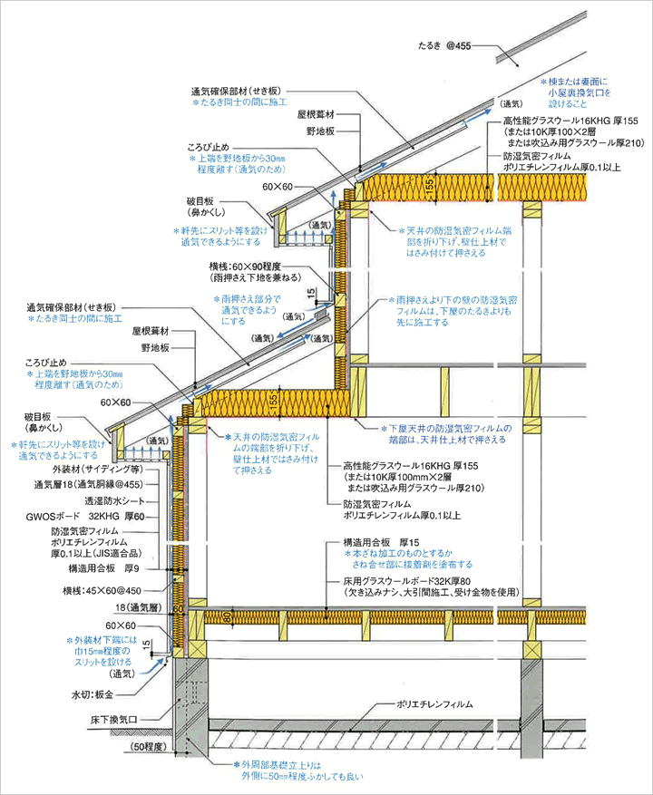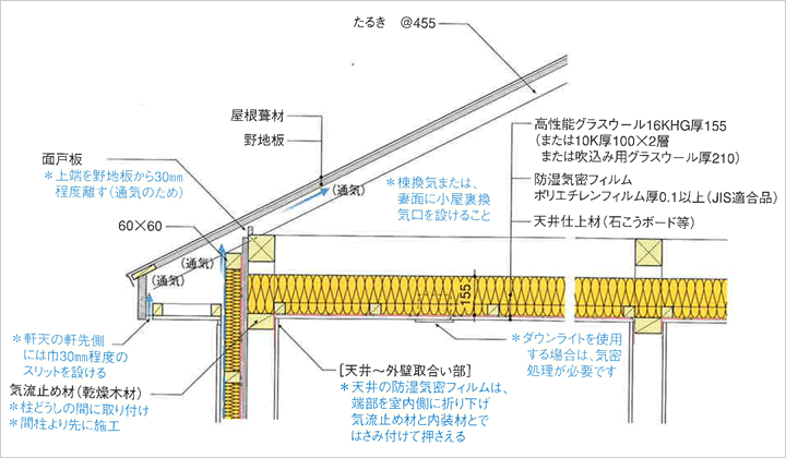 断熱材:高性能グラスウール16KHG 厚155mm (または グラスウール10K厚100mm×2層/吹込み用グラスウール厚210mm)