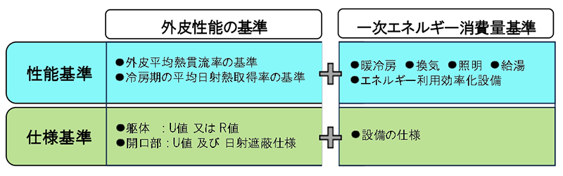 主に、外皮性能は「建築による手法」の技術により、一次エネルギー消費量は「設備(暖冷房・換気・照明・給湯・太陽光などのエネルギー利用効率化設備)による手法」によって、達成すべき水準を定めています。