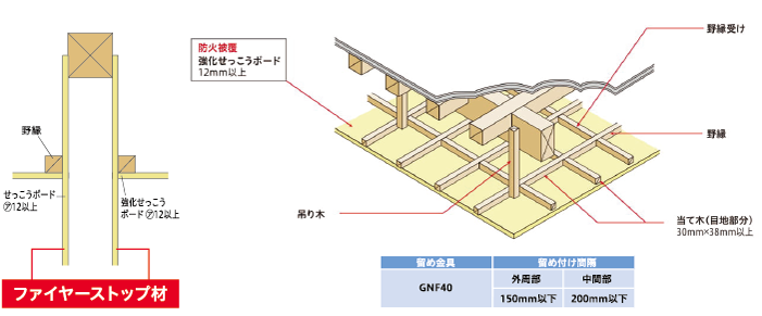 壁・天井内部の火炎の通り道にファイヤーストップ材を設置(上階に床が