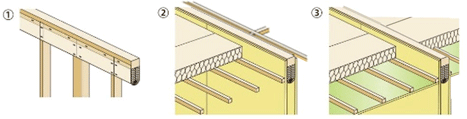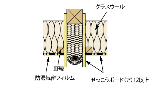 ③野縁の室内側に防湿気密フィルムを張り、せっこうボードで留め付けます。