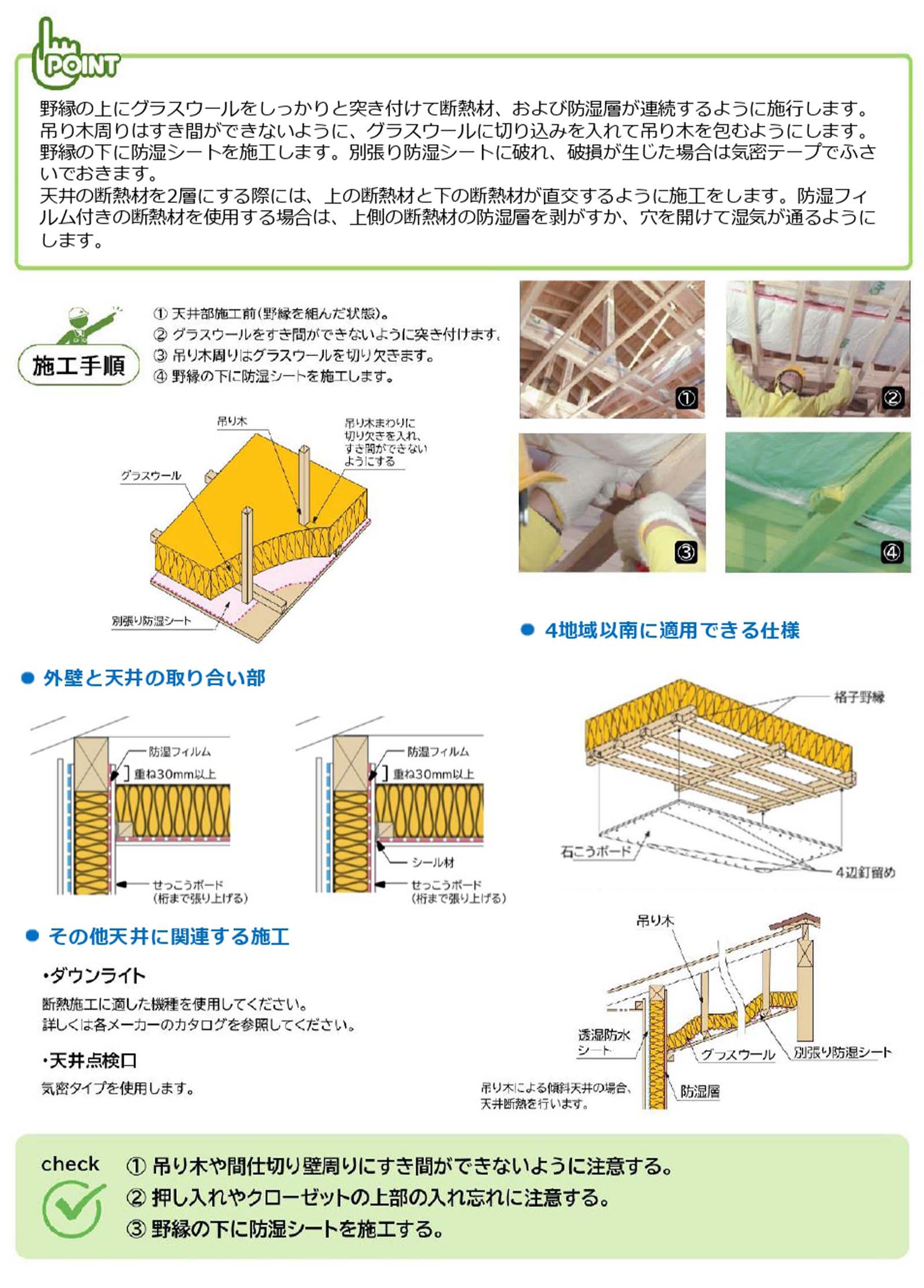 野縁の上にグラスウールを天井全面にわたって敷き込み、野縁の下に防湿層を施工します。